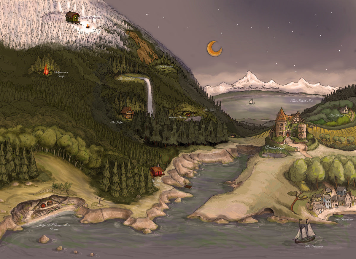 Search the coastline, and you may find a hidden cove with a glittering grotto—home to Judge DP Bonneville. Its walls shimmer with shells, glowing in the dim light.
